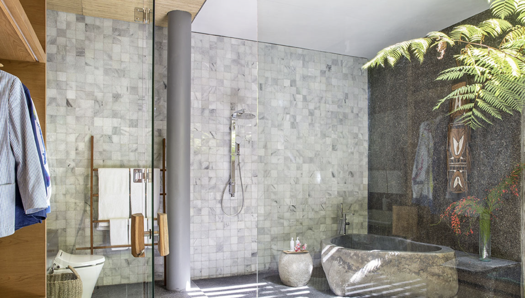 The spacious four bedroom villa spans two floors with free spaces and plenty of natural light coming in. One side of the house opens onto a green, tropical garden while the other side of the house opens onto the lawn and the private swimming pool – thus enveloping the house in abundant natural beauty. The villa shares a multi-functional gym cum yoga space with the other two villas giving guests an opportunity to interact with each other.