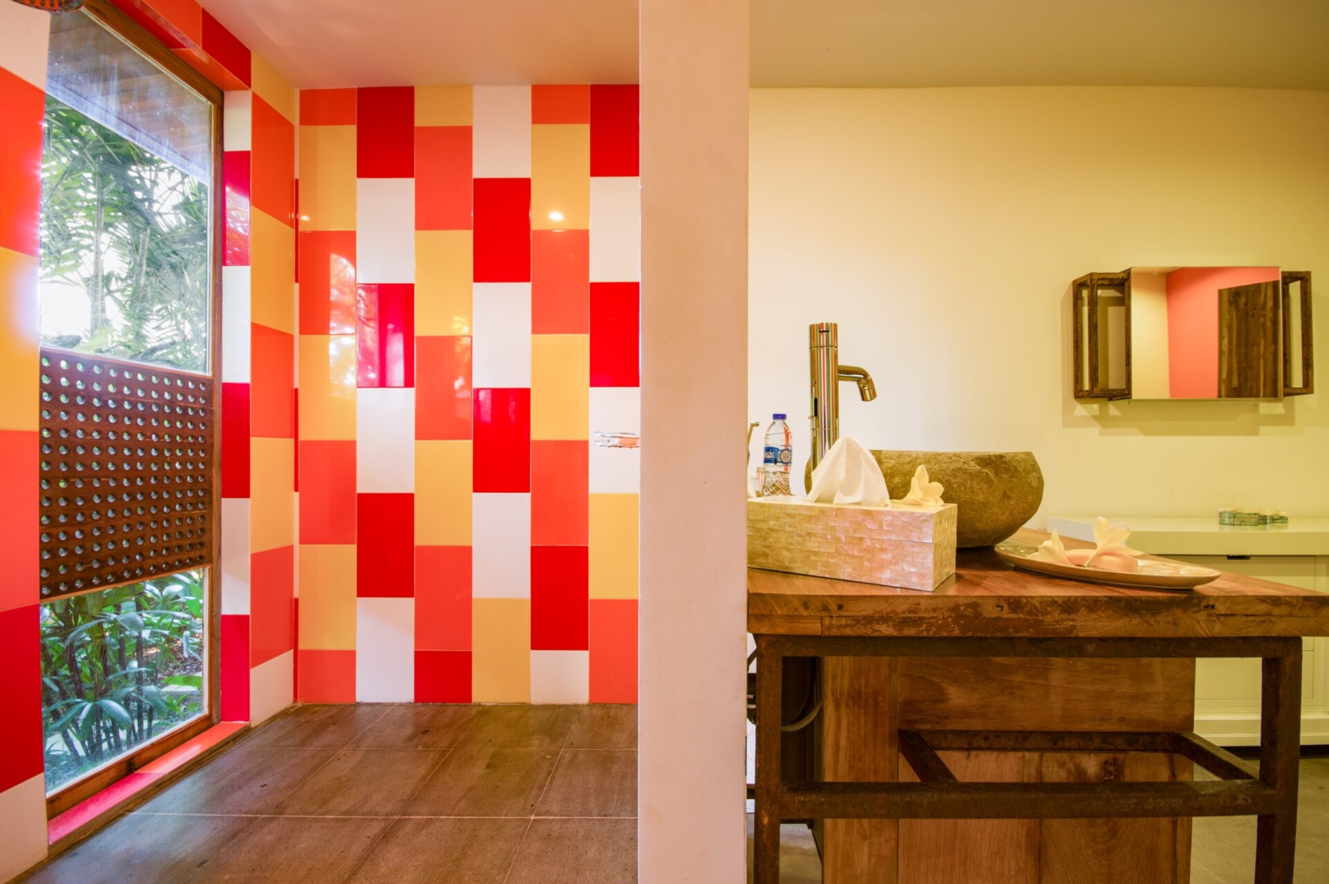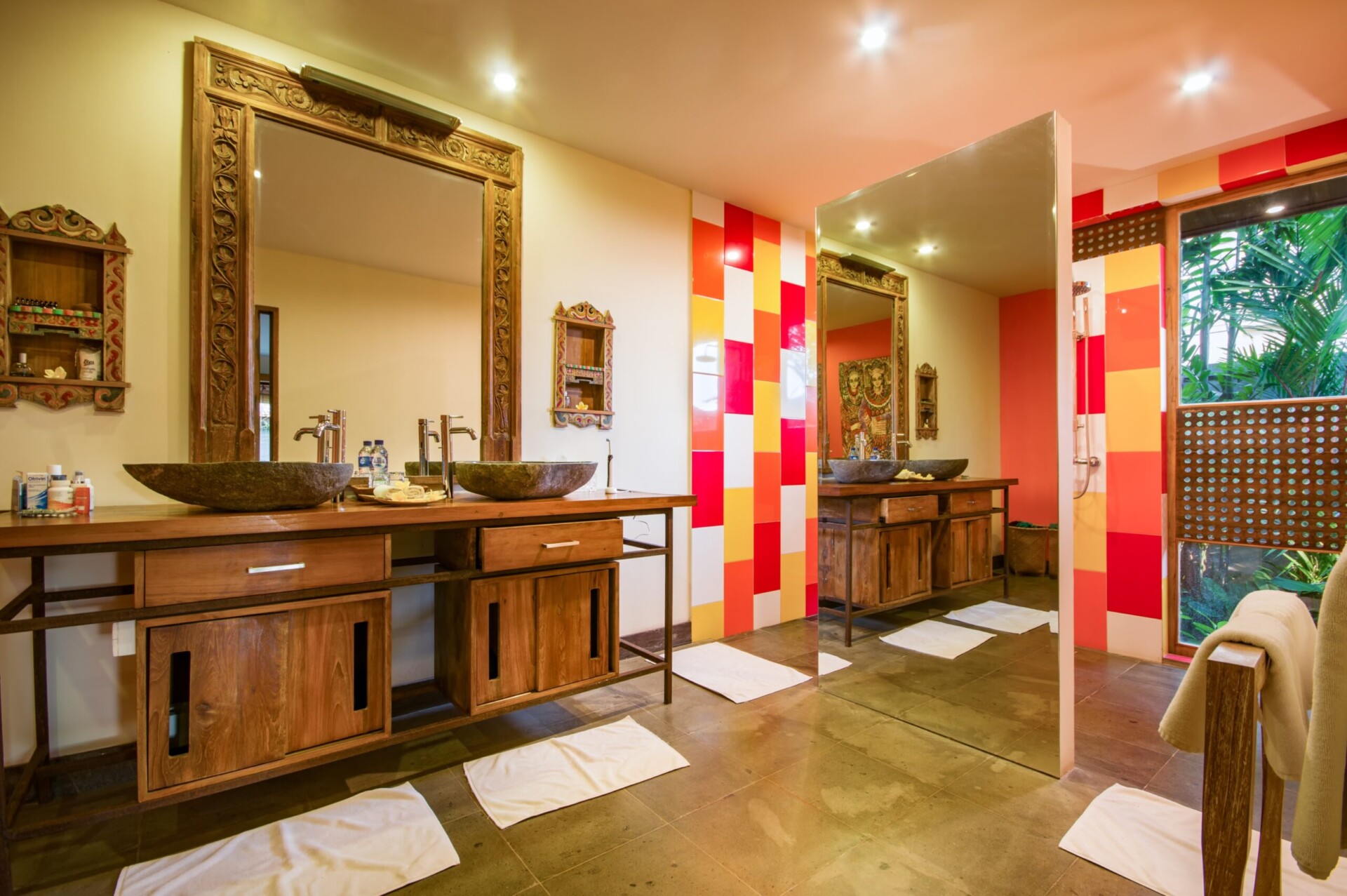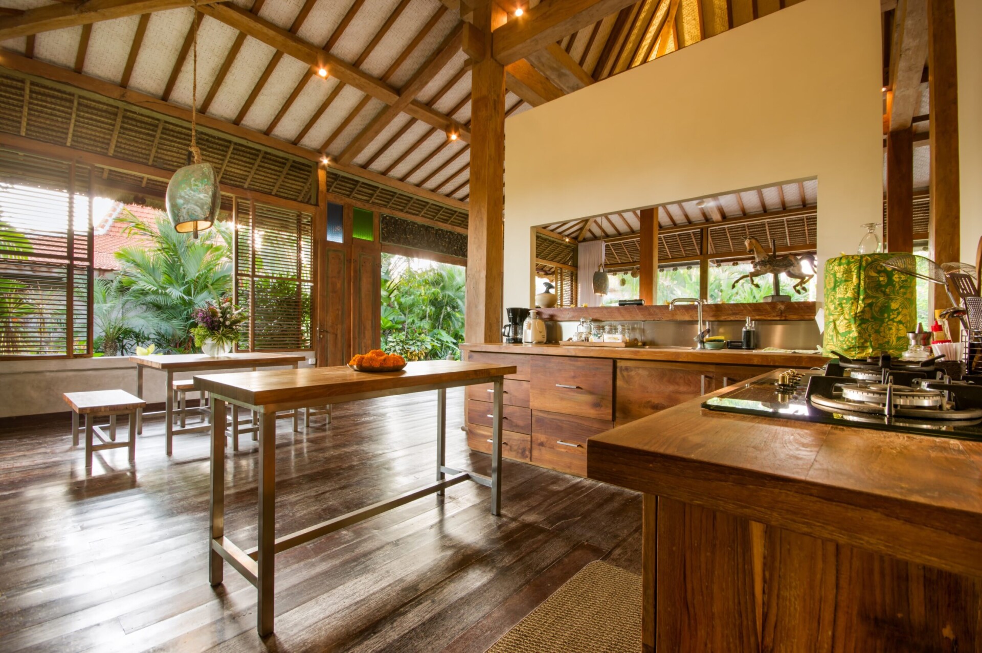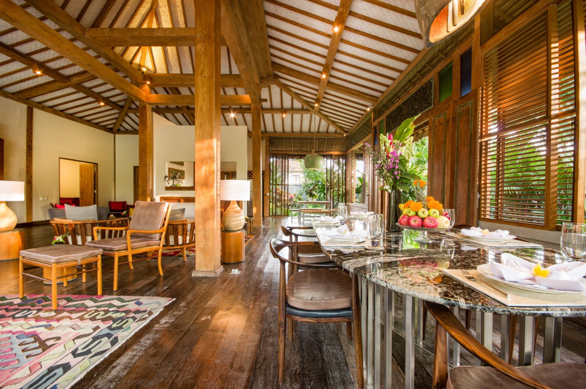 Choose from one of two bedrooms, both furnished with king-sized beds and air-conditioning to keep you comfortable on those warm nights. Both bedrooms have a very modern aesthetic, complemented with local artworks and Balinese accents. Enjoy en suite bathrooms almost as big as your bedroom, fitted with his and her sinks and walk-in rain showers. Access these spacious rooms either through wide solid doors or wall-length balcony doors, which lead directly to the common area and the swimming pool or pond respectively. As dusk falls, pull the mosquito nets down over the bed, and rest shielded in your little cocoon, your own little space away from the rest of the world.