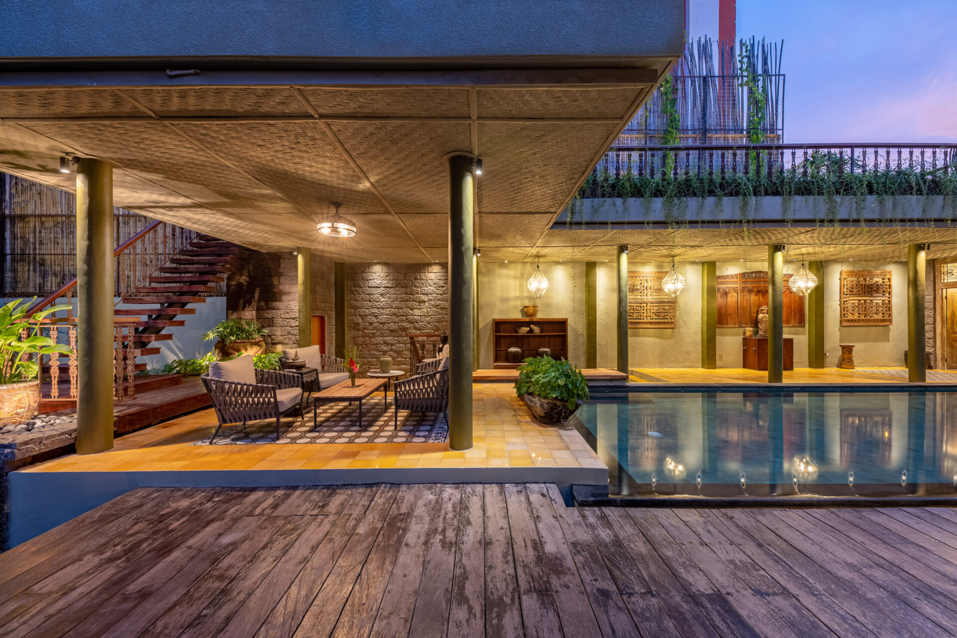 On the ground floor, you’ll find a fully equipped kitchen and a beautiful teakwood dining table perfect for gathering with friends or family. Behind the kitchen is a service area for the staff, while nearby, a vibrant and colorful lounge offers the ideal spot for reading