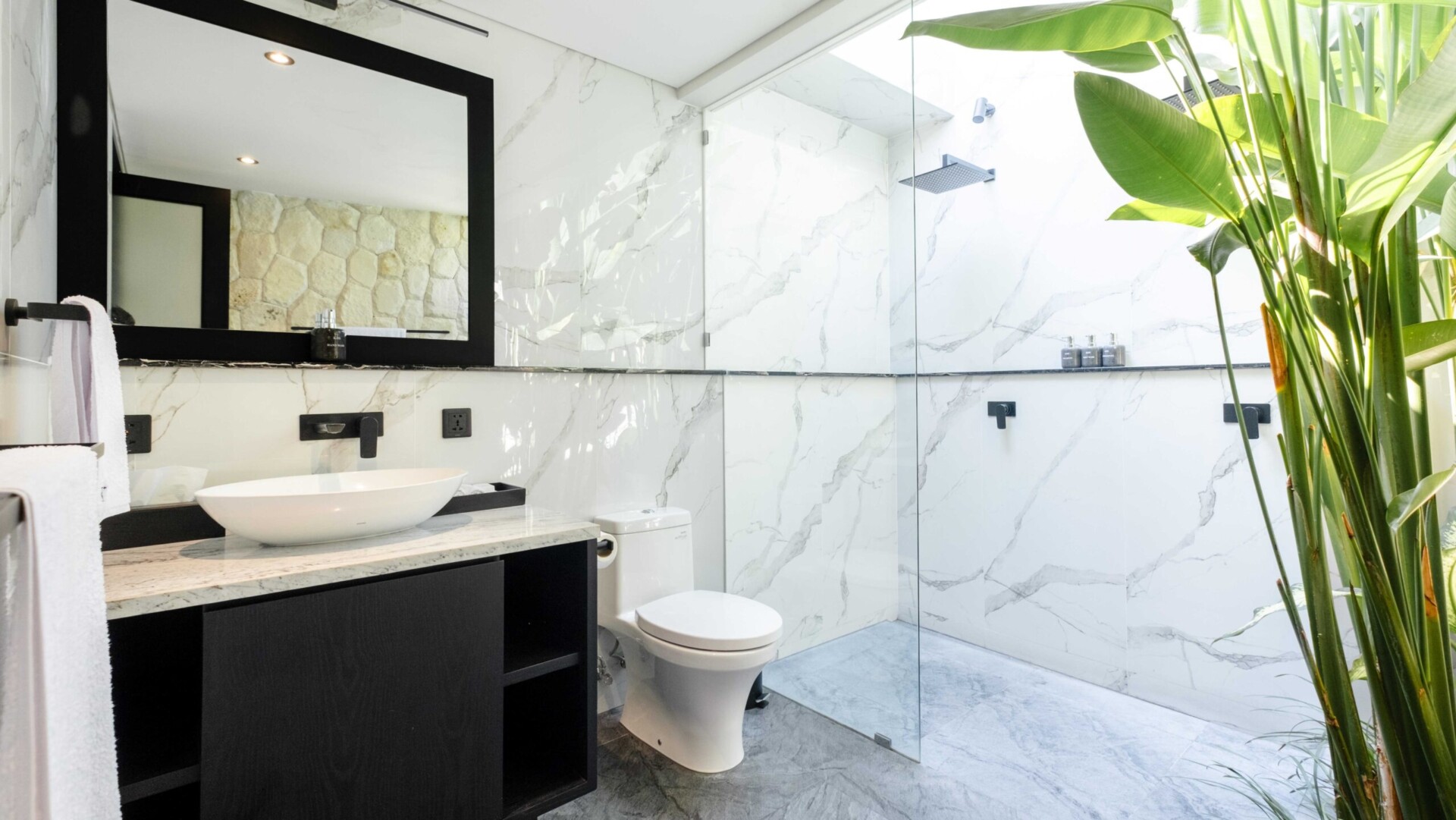Each of the five bedrooms in Villa Kubu Dewi Sri is a sanctuary of comfort and style. The rooms are furnished with plush king-size beds, sleek black and white decor, and modern amenities including Smart TVs. Large windows offer views of the lush tropical gardens and flood the rooms with natural light, creating an ambiance of serenity. The en-suite bathrooms are equally impressive, boasting luxurious marble finishes, spacious showers, and some feature deep soaking tubs. Two of the ensuite bathrooms offer a bathtub for the ultimate relaxation.