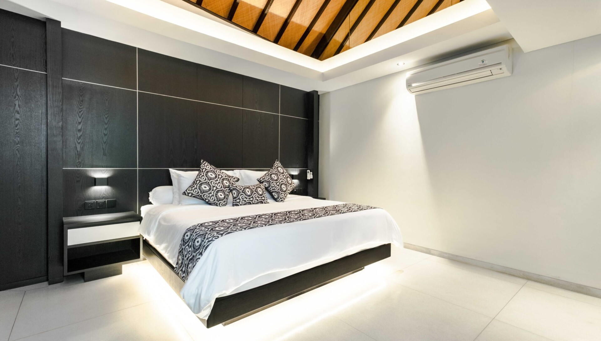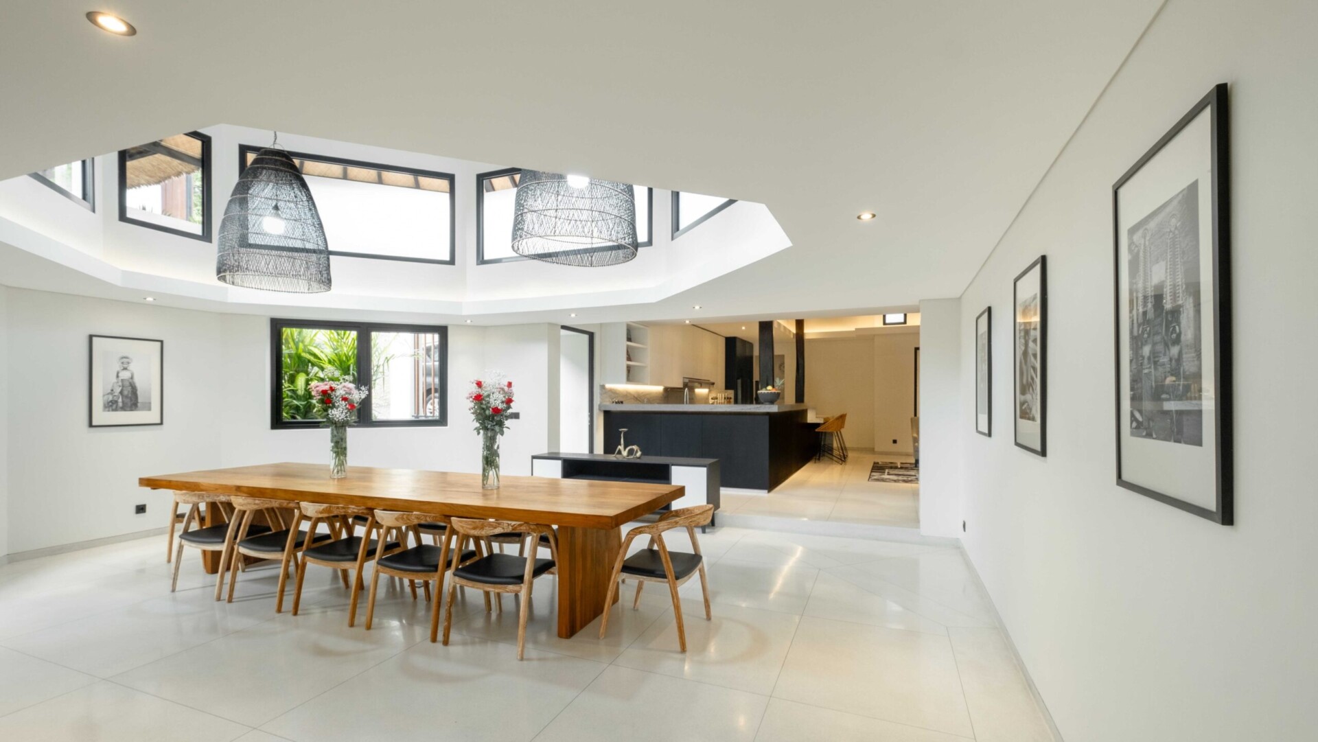 There are three main living areas in this villa; the open kitchen, seating/media corner and the dining area. The entire living room is a curated joglo-style design with a roof that is high in the center, and the walls are partly open to give you beautiful views of the swimming pool and the garden around. The seating area consists of a large flat screen tv where you can enjoy your favorite movie sitting on the long couches that make for a nice little cozy corner to relax. The long wooden dining table seats up to 12 people comfortably, and the kitchen is fully equipped and open to the guests when you feel like cooking your own meals.