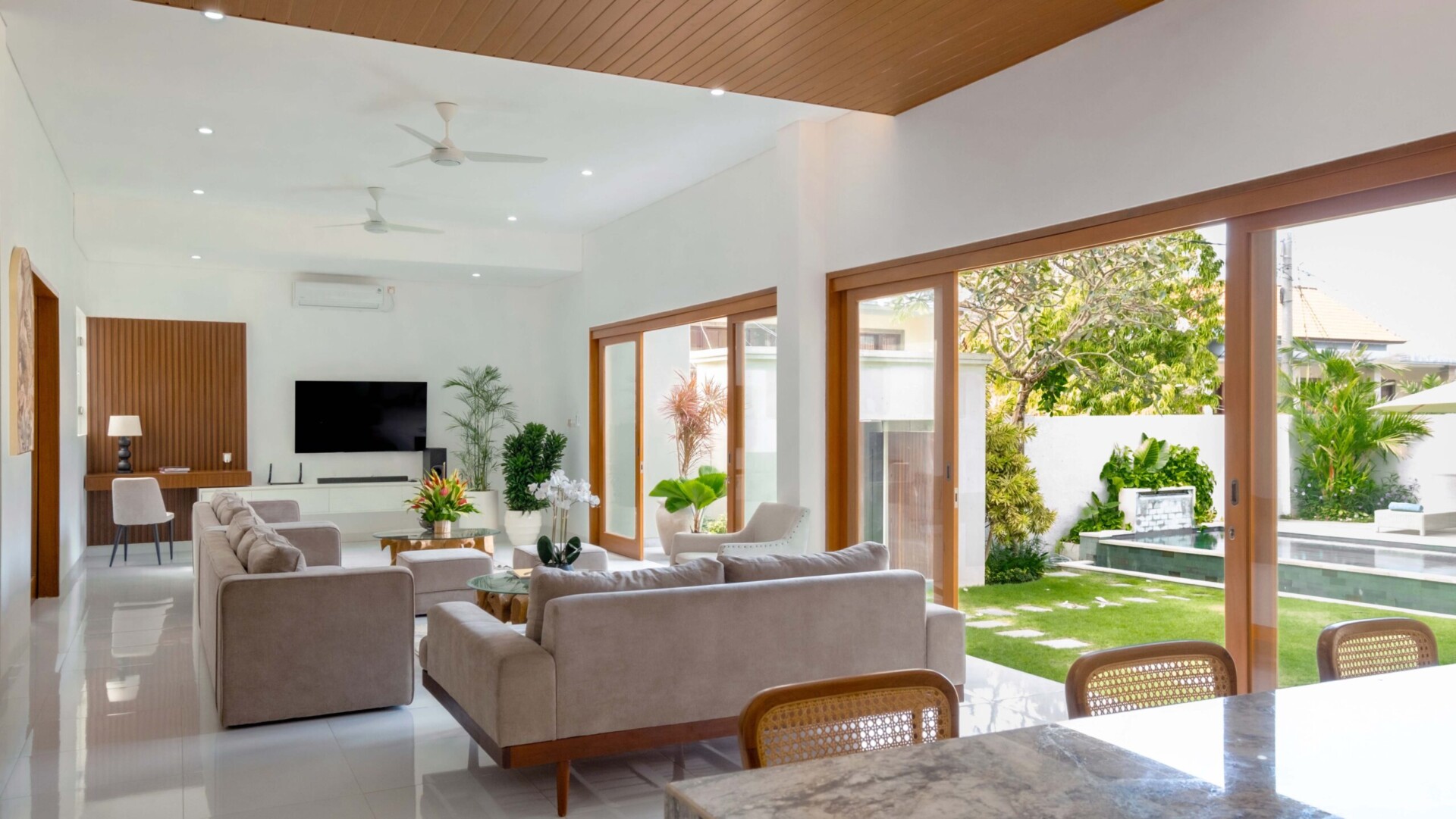 Situated in the idyllic setting of Seminyak, Villa Latima is a stunning haven of peace and tranquility. Surrounded by lush greenery, the villa’s exterior exudes an aura of modern elegance, with clean lines and a harmonious blend of white walls and warm wood accents. This seamless integration of natural elements and contemporary design creates an inviting ambiance that complements the serene environment, perfect for unwinding and escaping the hustle and bustle of everyday life.