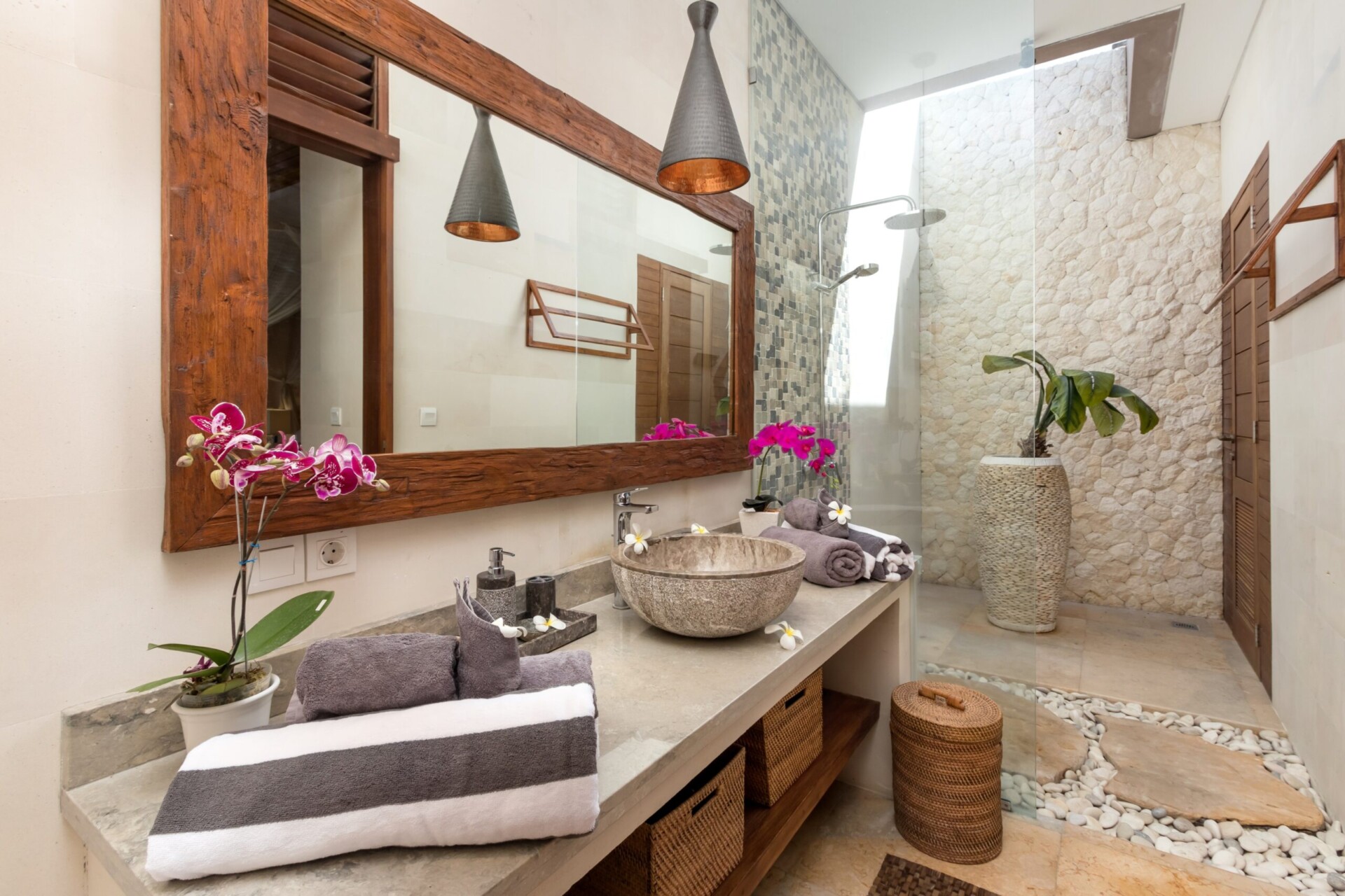 The villa has 3 beautifully laid-out bedrooms that display the perfect confluence of modern and traditional Balinese styles. The three rooms also have unique names. The Kokokan bedroom is named after a white heron. The Murai bedroom is named after the beautiful magpie. And the Kutilang bedroom is named after a small songbird. All three have large king beds.