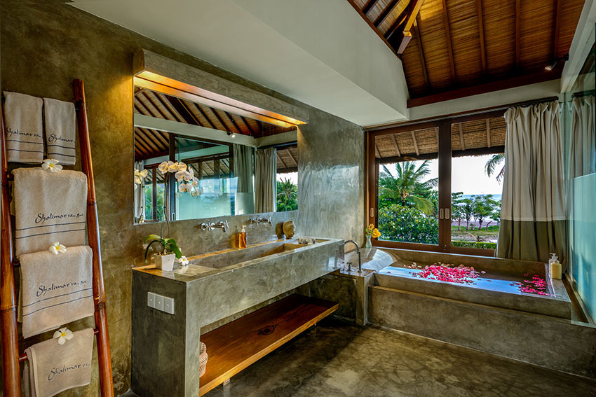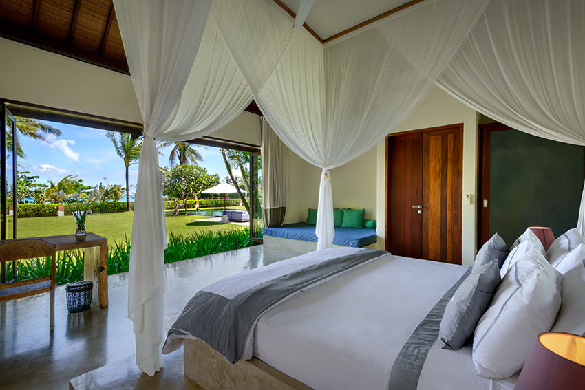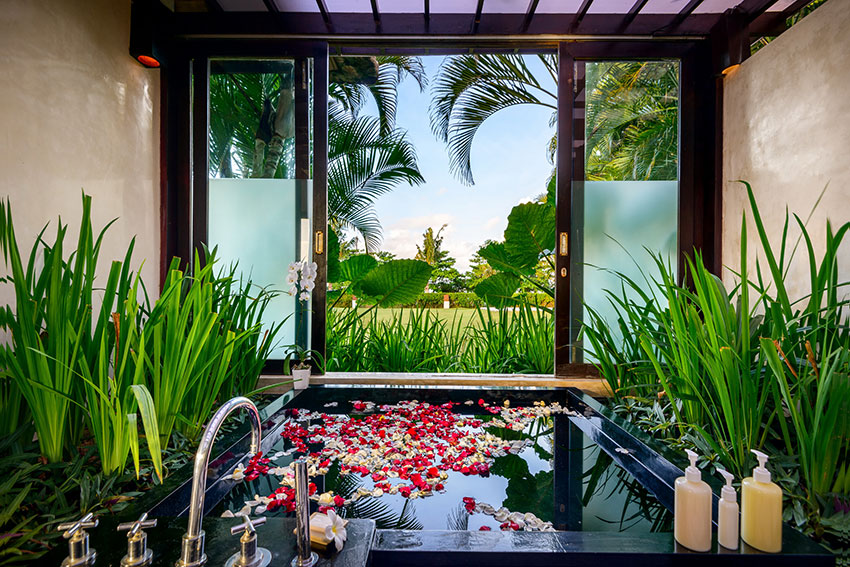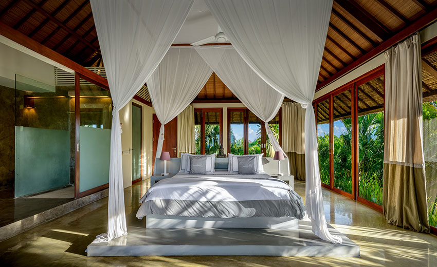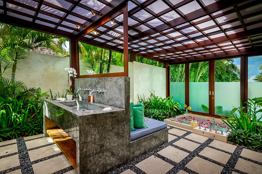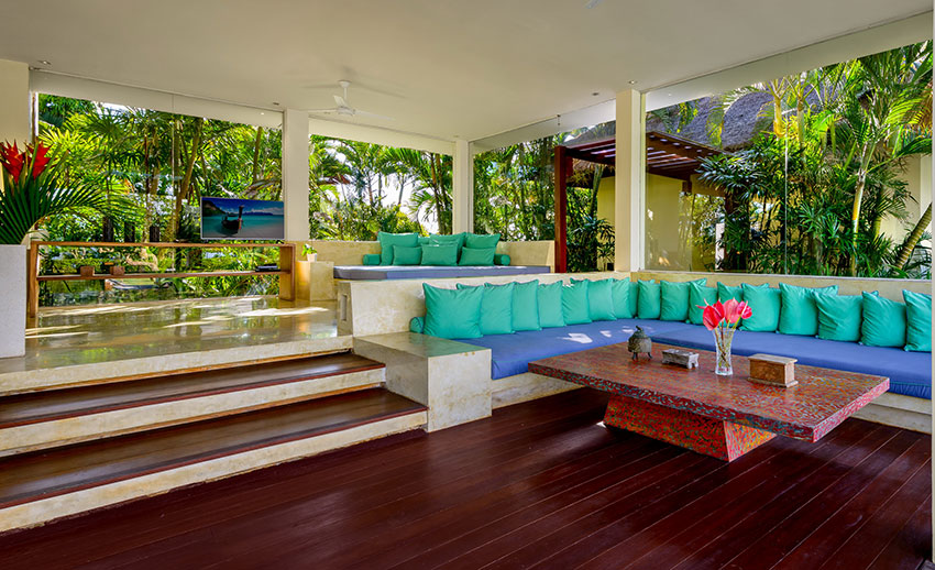Villa Makanda has four air-conditioned master suites and each of the bedrooms is luxuriously furnished with king-sized beds, and has marble flooring. The bedrooms have glass doors on three sides, which open out to the tropical gardens and the pool. Each bedroom is a sight to behold with traditional décor and modern comforts. Daybeds are fitted in the rooms, a quiet corner for reading or introspection on your great tropical holiday. The en-suite bathrooms are fitted with all natural stone flooring and lavish bathtubs that will remind of you a luxe spa. Some of the bathrooms have sunken bathtubs and a wooden lattice roof for sunlight to seep into the bathrooms.