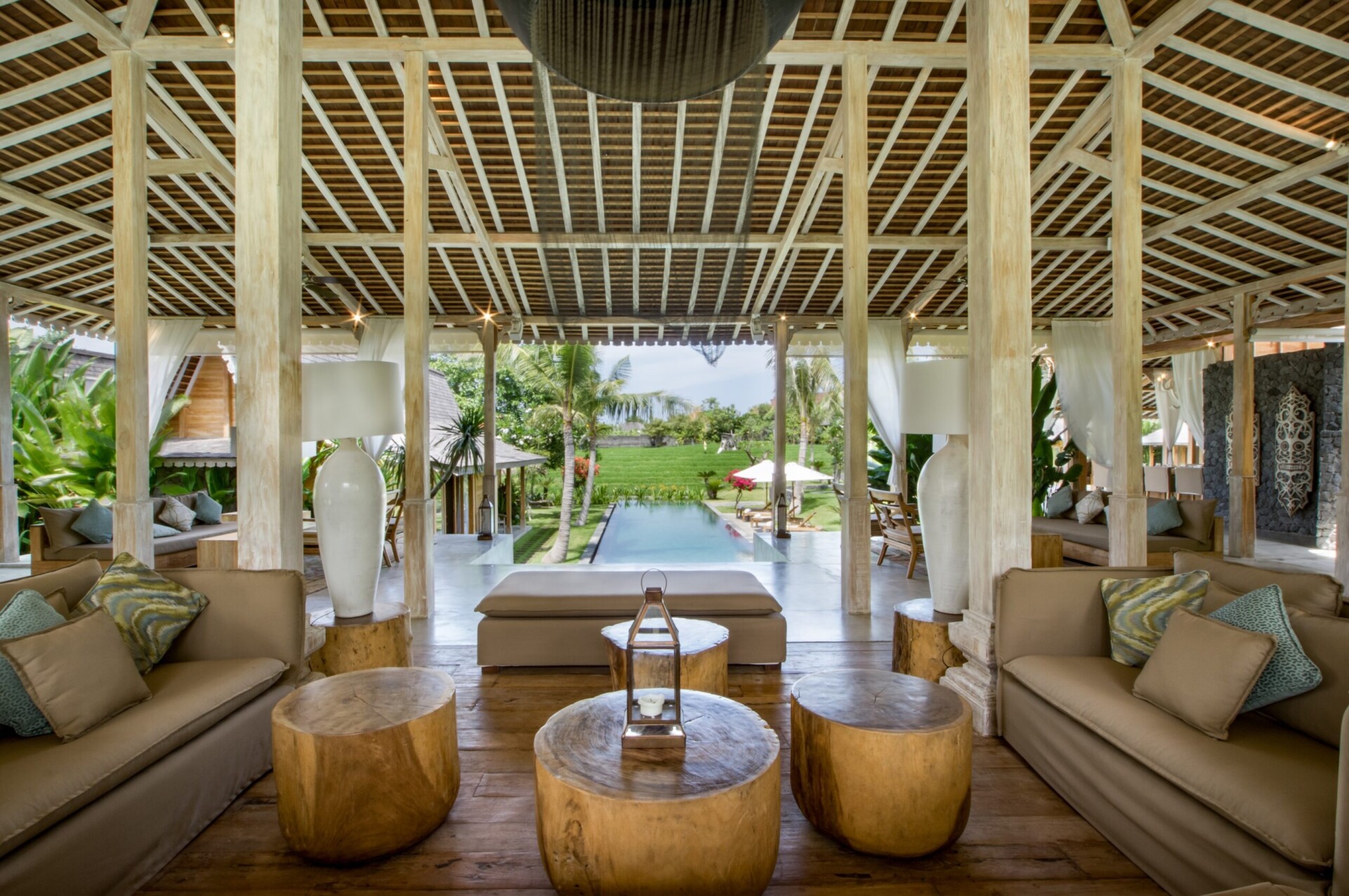 The villa has eight bedrooms and can accommodate as many as twenty people. With its alang-alang thatch and joglo-type structure, Villa Mannao is traditionally Balinese in its appeal. Its open living spaces, soaring columns, garden showers, infinity pools and luxurious bedrooms, the villa is an ideal getaway for large groups who want to enjoy an exclusive vacation in the heart of Bali. The furnishings made of distressed wood have a very chic and contemporary appeal.