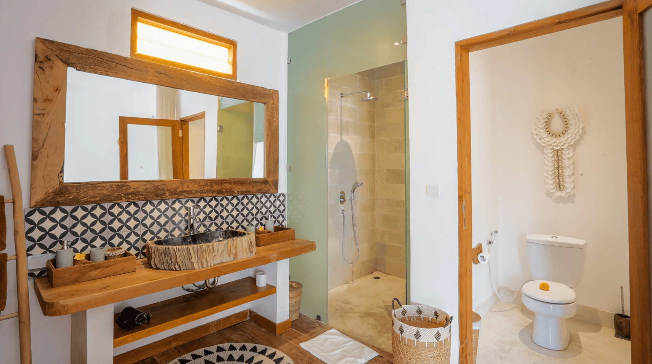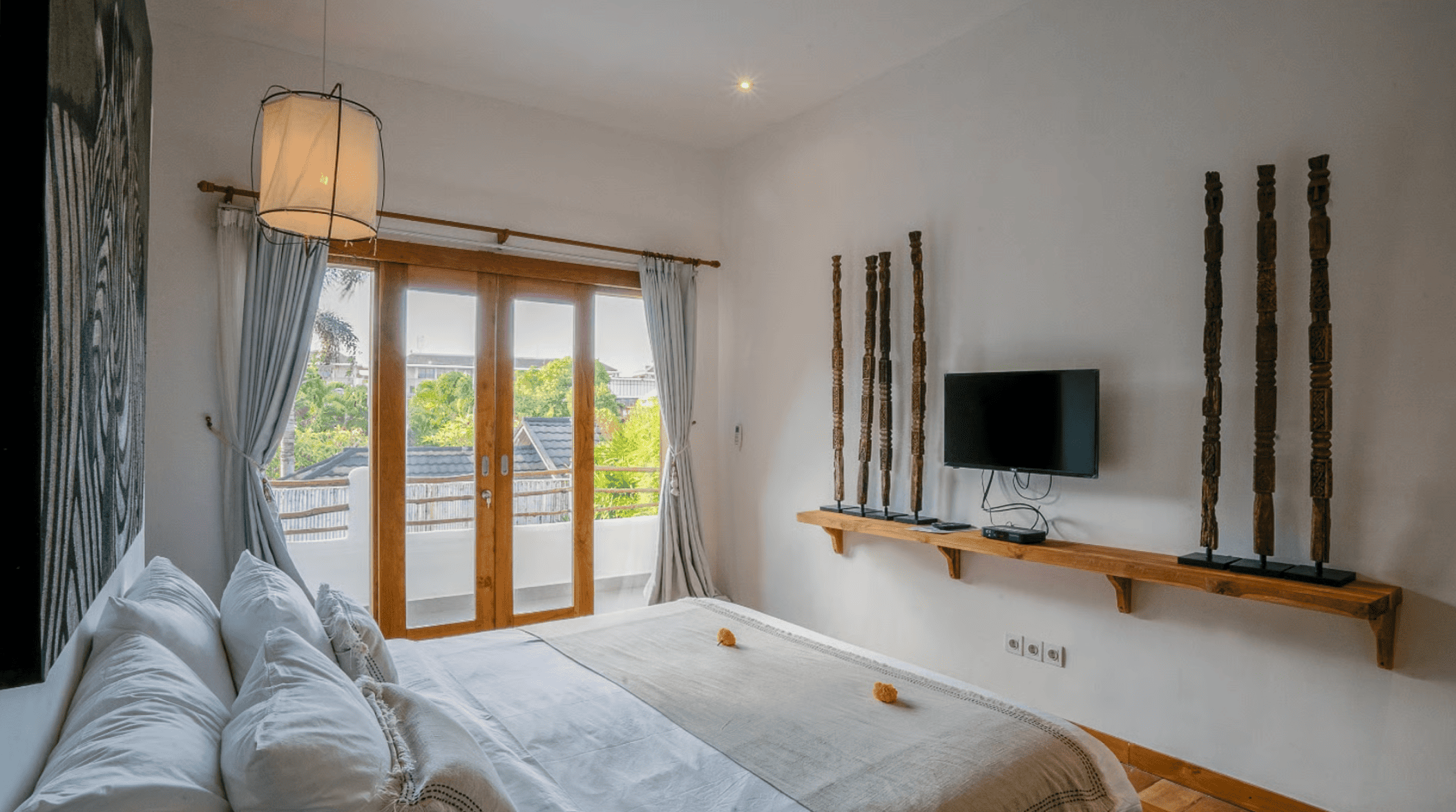 This beautifully exotic and vibrant villa is surely not yet another villa in Seminyak, but a completely joyful experience in and of itself. It has all the regular features of a villa including a swimming pool, but every single aspect of this villa has a delightful twist to it include the swimming pool which can be almost mistaken for a fully natural pond due to its shape and design. Large modern artwork on the walls makes a pleasant balance with the traditional furniture and the wooden floor with an elevated elegance added from the pure white bedding and recurring white touches on many of the villa surfaces. It is spacious enough for a large family, fun enough for young travelers, safe enough for children and romantic enough for couples and honeymooners.