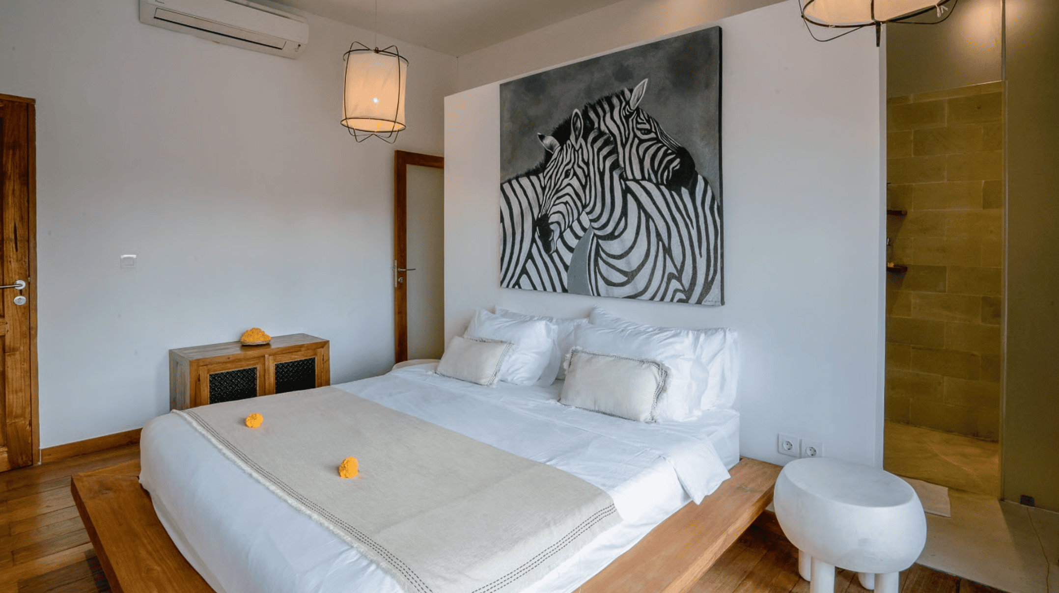 This beautifully exotic and vibrant villa is surely not yet another villa in Seminyak, but a completely joyful experience in and of itself. It has all the regular features of a villa including a swimming pool, but every single aspect of this villa has a delightful twist to it include the swimming pool which can be almost mistaken for a fully natural pond due to its shape and design. Large modern artwork on the walls makes a pleasant balance with the traditional furniture and the wooden floor with an elevated elegance added from the pure white bedding and recurring white touches on many of the villa surfaces. It is spacious enough for a large family, fun enough for young travelers, safe enough for children and romantic enough for couples and honeymooners.