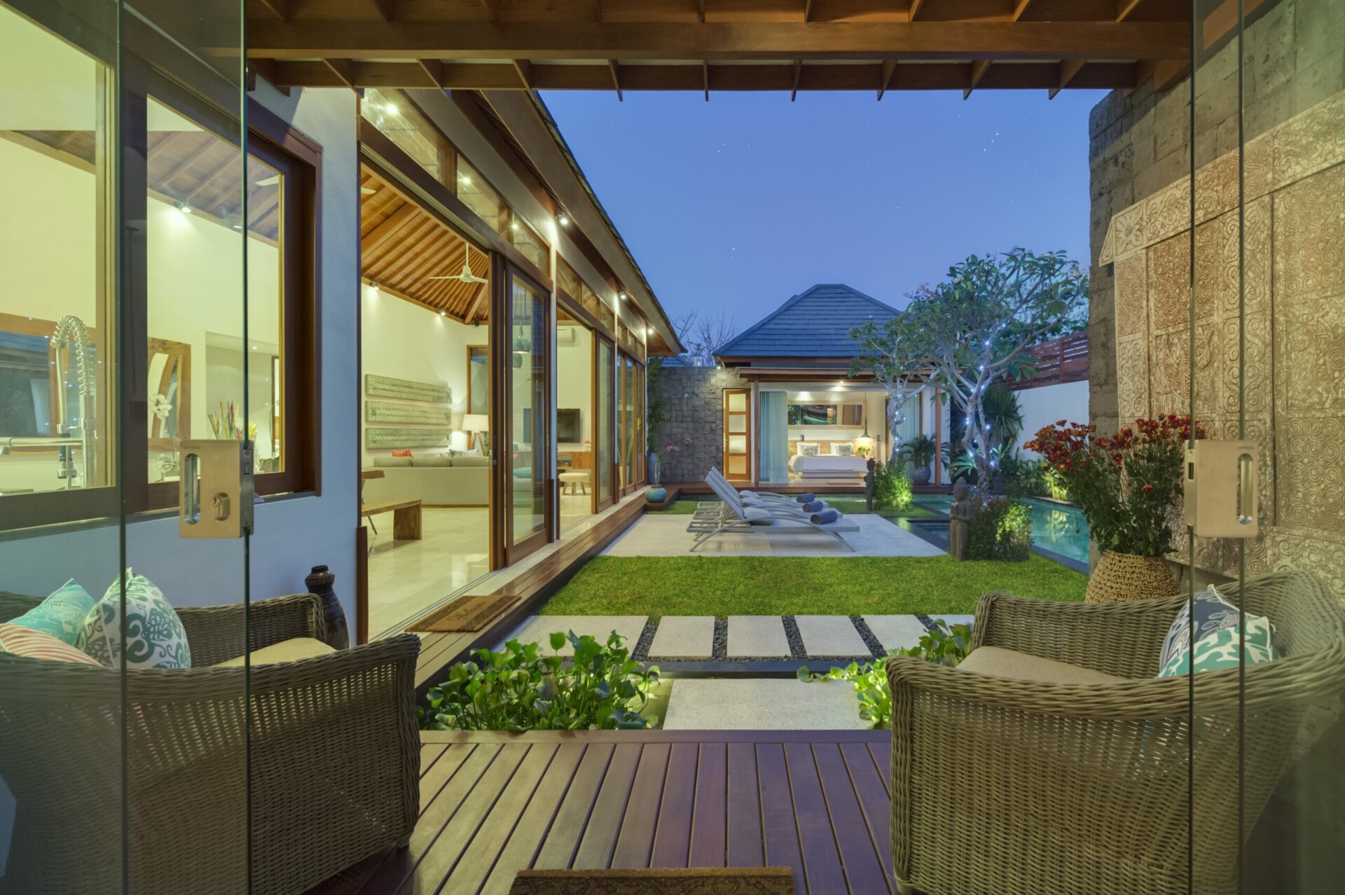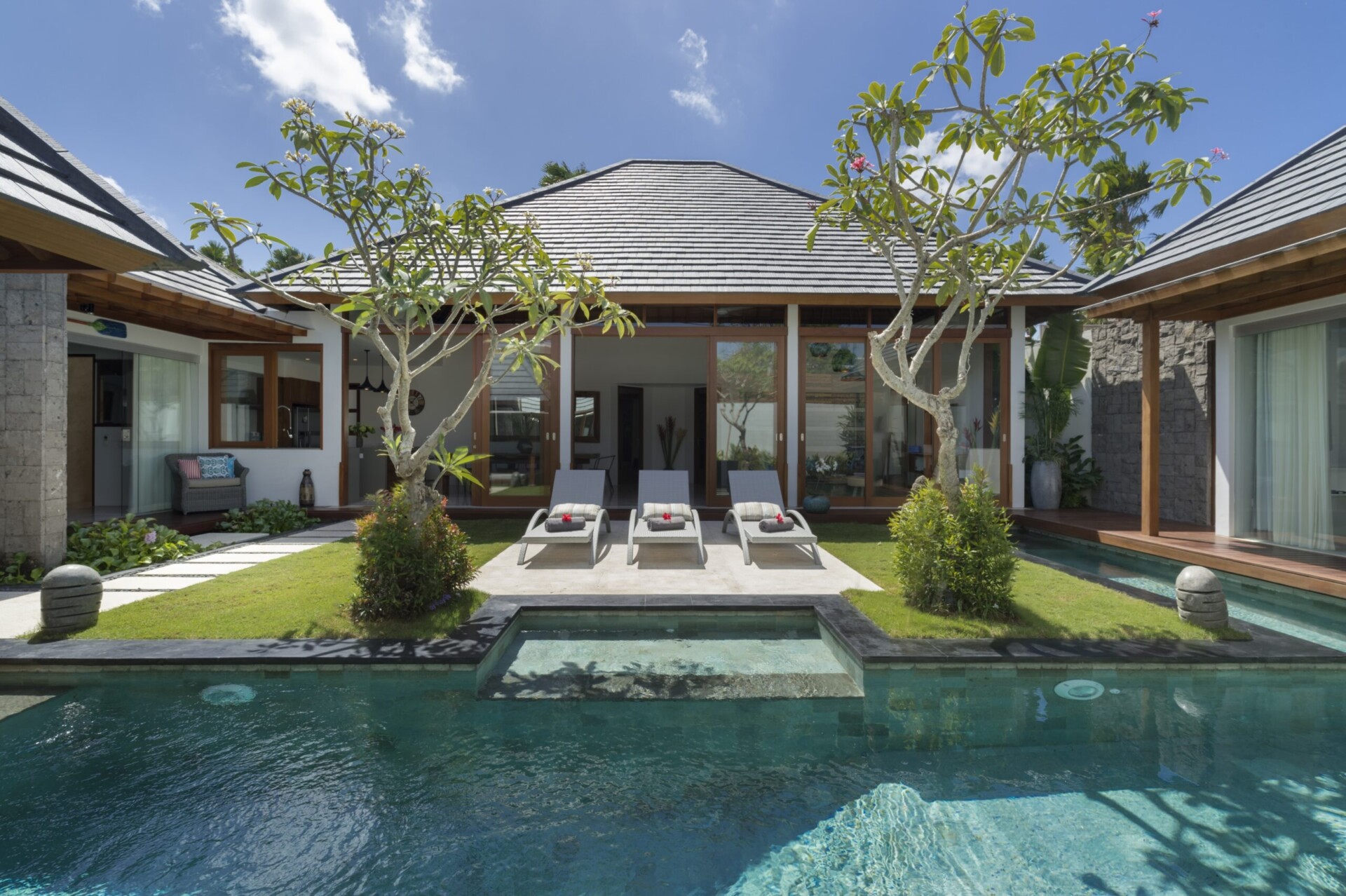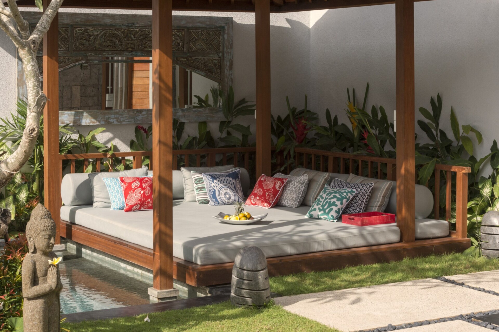 The design of the villa garden has also kept to the theme of clean and minimalistic finish that they have maintained in the entire villa. You get a narrow and long swimming pool with a child-friendly shallow end where your little ones can safely swim and play. At the far end of the swimming pool, there is a beautifully placed gazebo where you can relax after a few laps in the swimming pool. On the pool deck, there are cushioned lounge chairs for some basking of the tropical sun under the blue Bali sky. The lawn area is perfectly manicured and maintained daily to ensure that you wake up to a beautiful tropical garden every morning during your stay in the property. Moreover, there is a small pond with lotus blooms to further add to the lovely atmosphere of the villa garden.