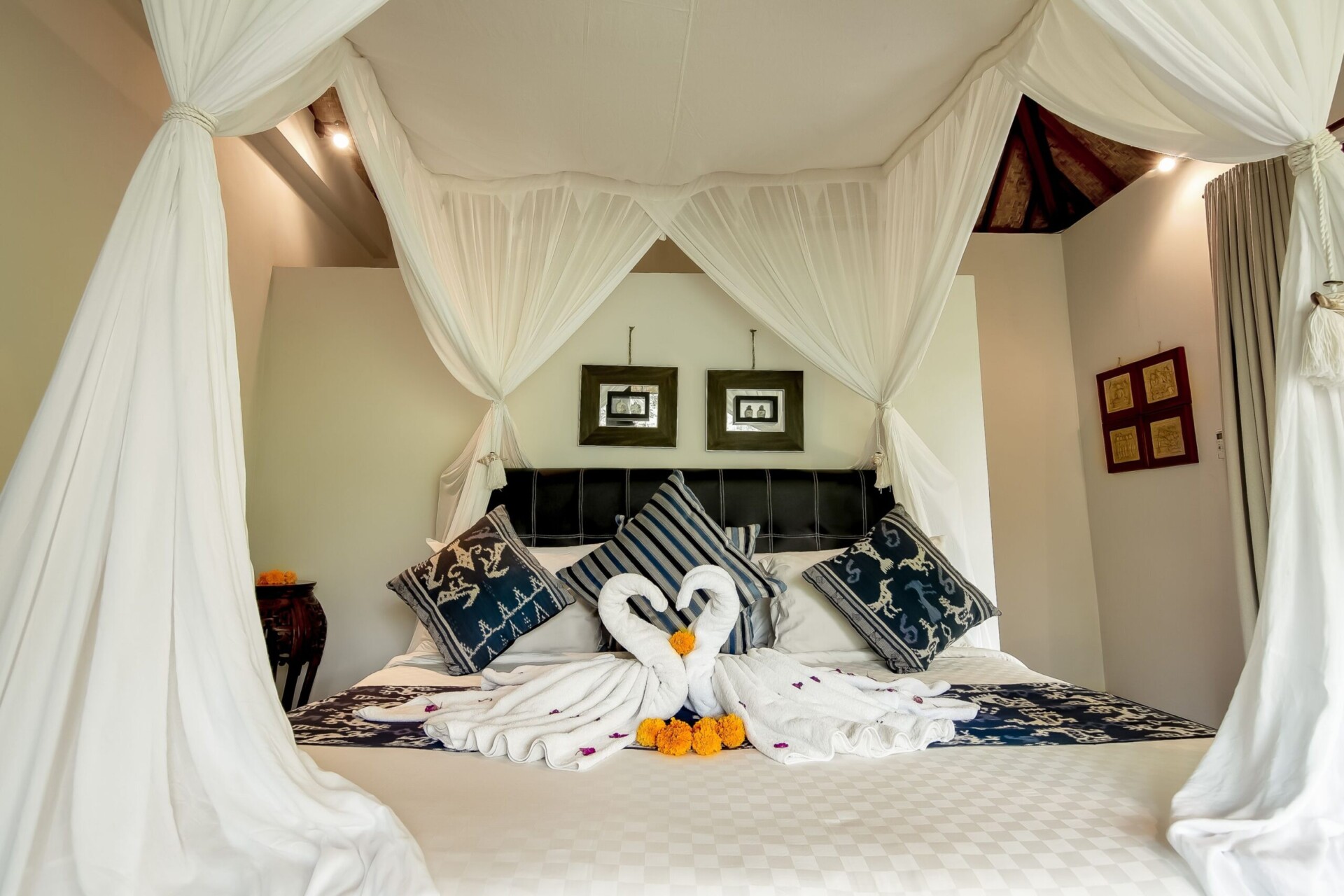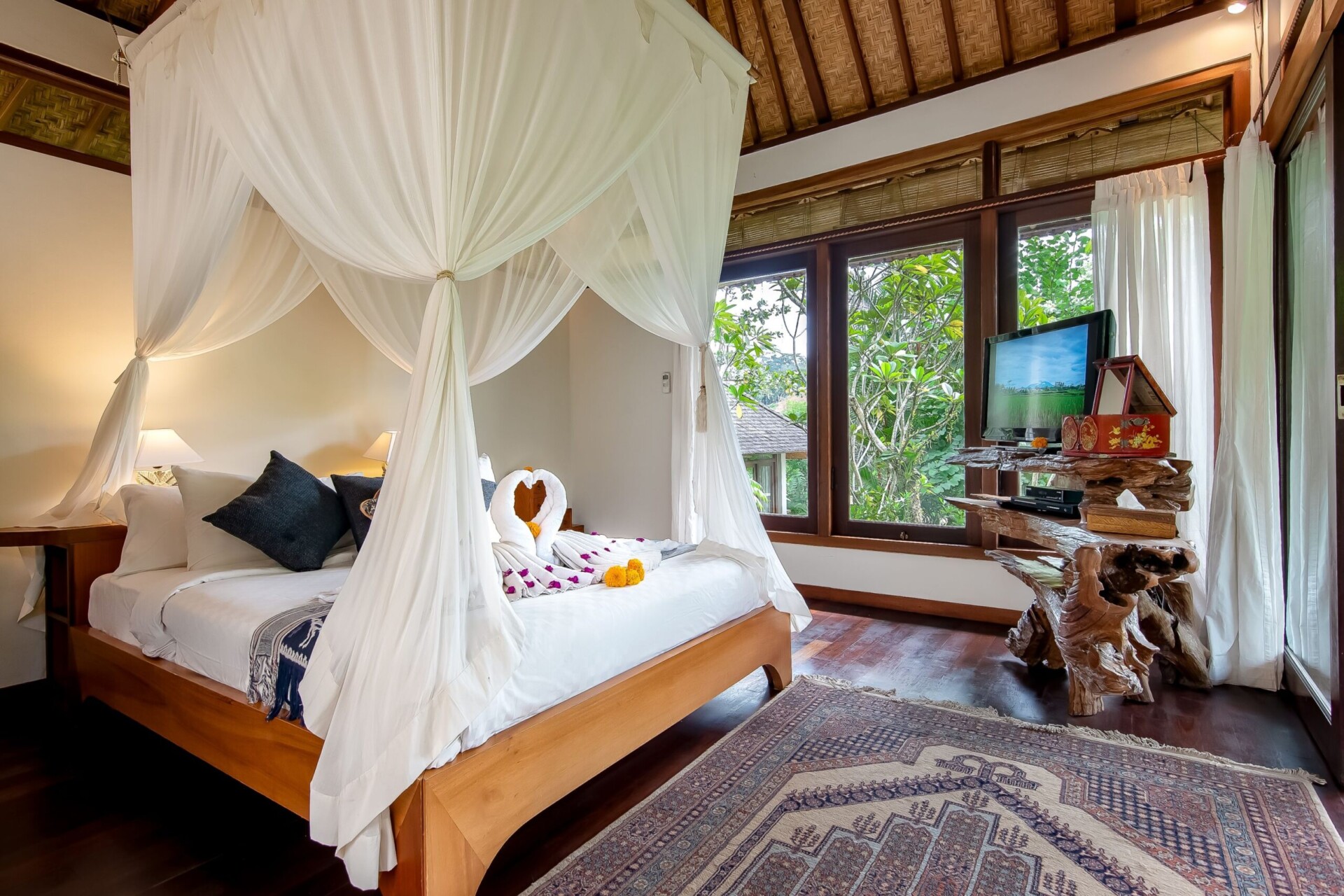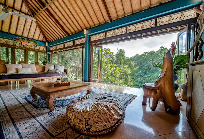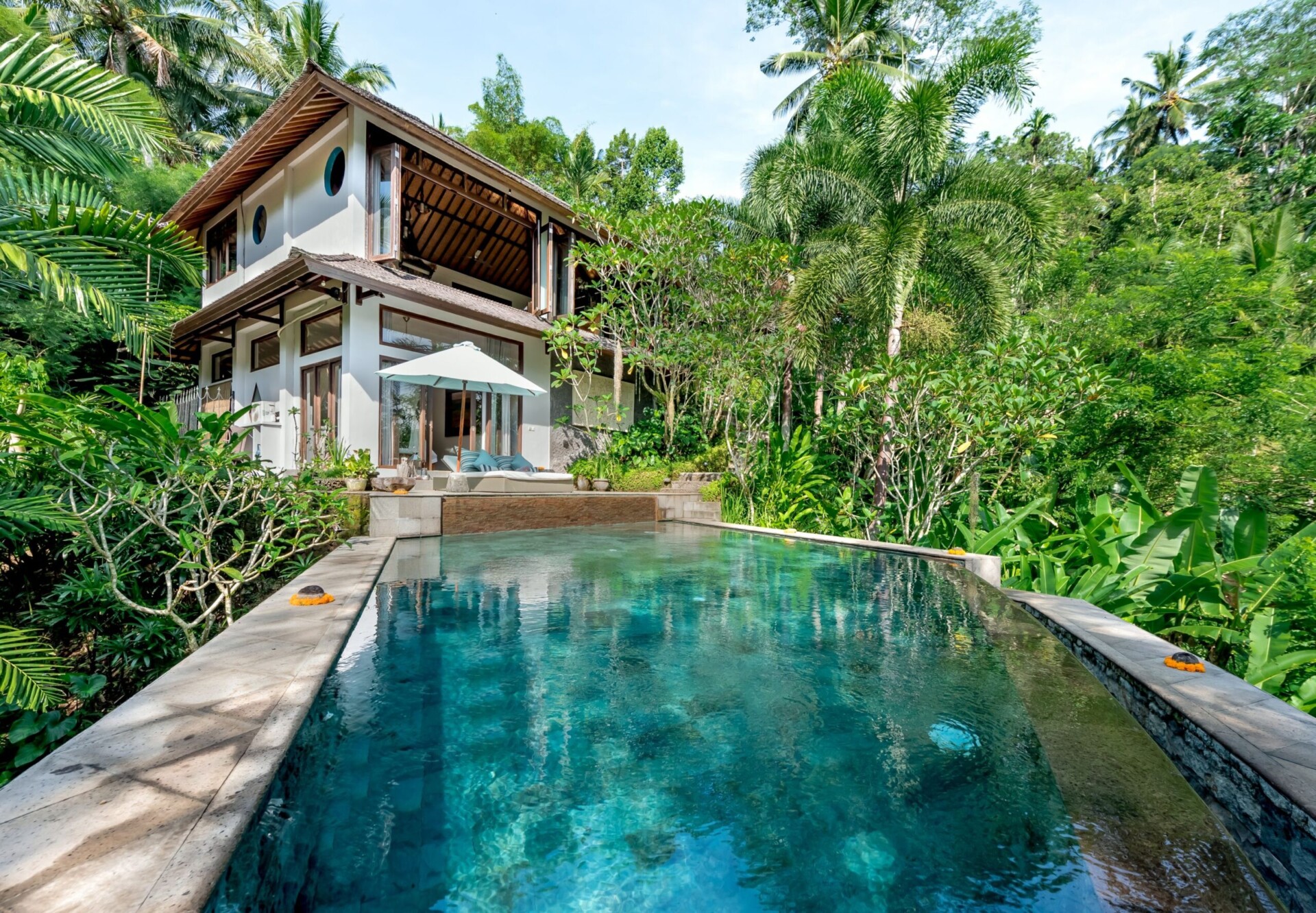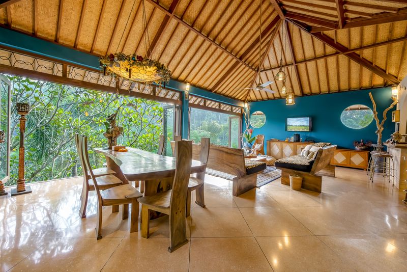 Set on the most beautiful location at the lovely Keliki River Valley with stunning panoramic views of the lush rainforest around it, Villa Umah Shanti is sure to blow your mind with its surrounding natural beauty and unique architecture. This beautiful forest front villa has three stunning bedrooms, each with its own private balcony and is incredibly family friendly. Modern amenities and traditional Balinese vibes blend together to give the villa an identity that stands out and is memorable. If you are looking for a vacation spot to relax and get lost in nature and its million wonders, then Villa Umah Shanti is the right pick for you. The rainforest stretches in front of you for miles and miles in front of you. The villa truly lives up to its name in being an abode of peace. The villa has many amazing features like a large garden bathroom with roomy soaking tubs, a glistening infinity pool overlooking the valley and a lovely study with a library of books and board games. The villa also offers free shuttles to the centre of Ubud.
